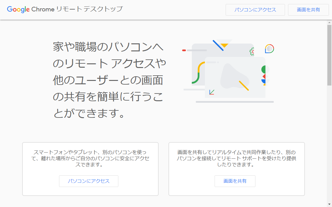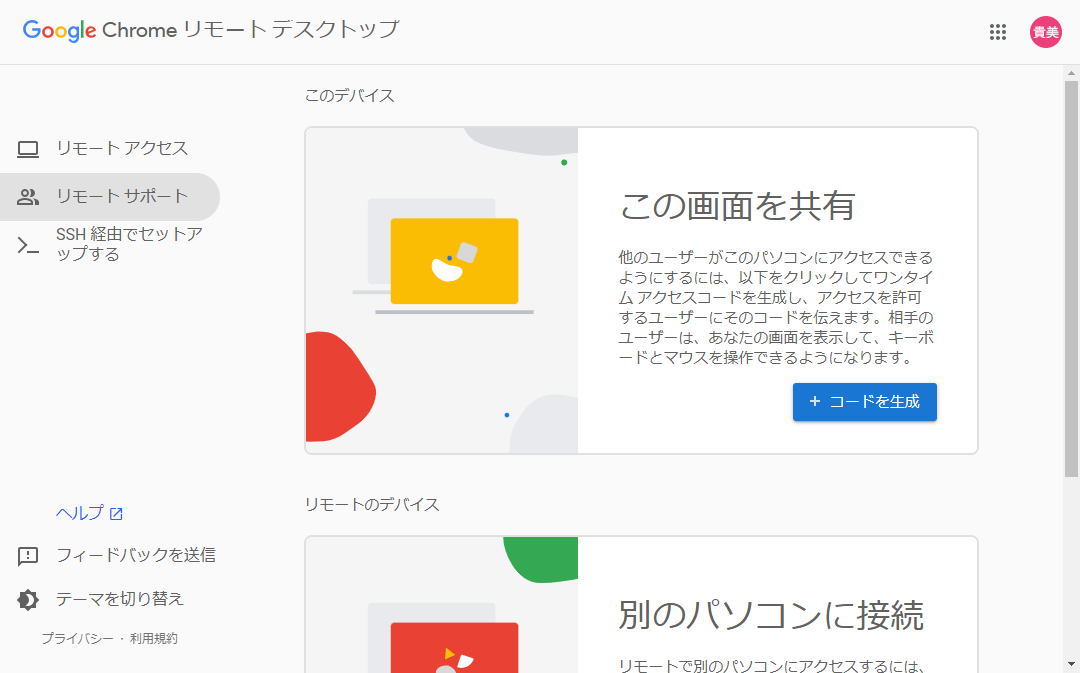 https://remotedesktop.google.com/homeにアクセスし、「画面を共有」ボタンを押します。