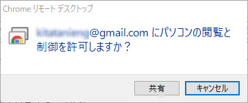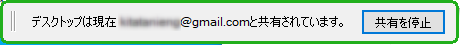 共有を終了する場合には、画面下にある、「デスクトップは現在○○@○○と共有されています。」の右にある、「共有を停止」を押すと、画面の共有、リモートデスクトップが終了します。